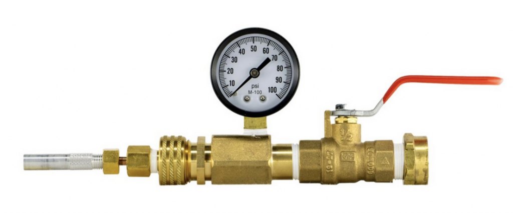 A geo-gooser is a manual, portable tool for adding or checking pressure in a geothermal system’s ground loop. It’s a standard part of a geothermal technician’s kit, consisting of a gauge, a valve, and a needle assembly that connects to a garden hose to add water or loop fluid through a PT (pressure/temperature) port.